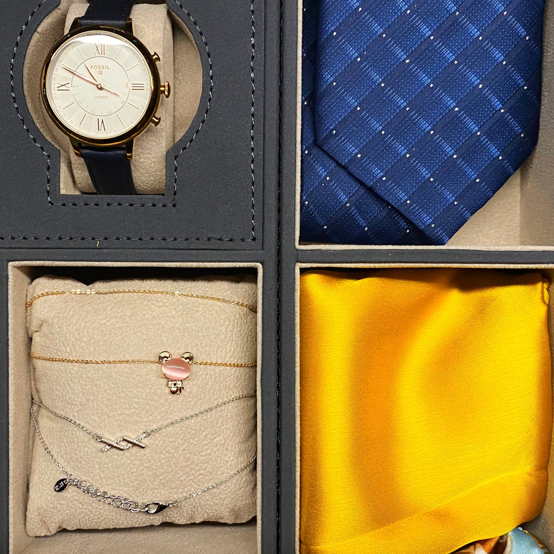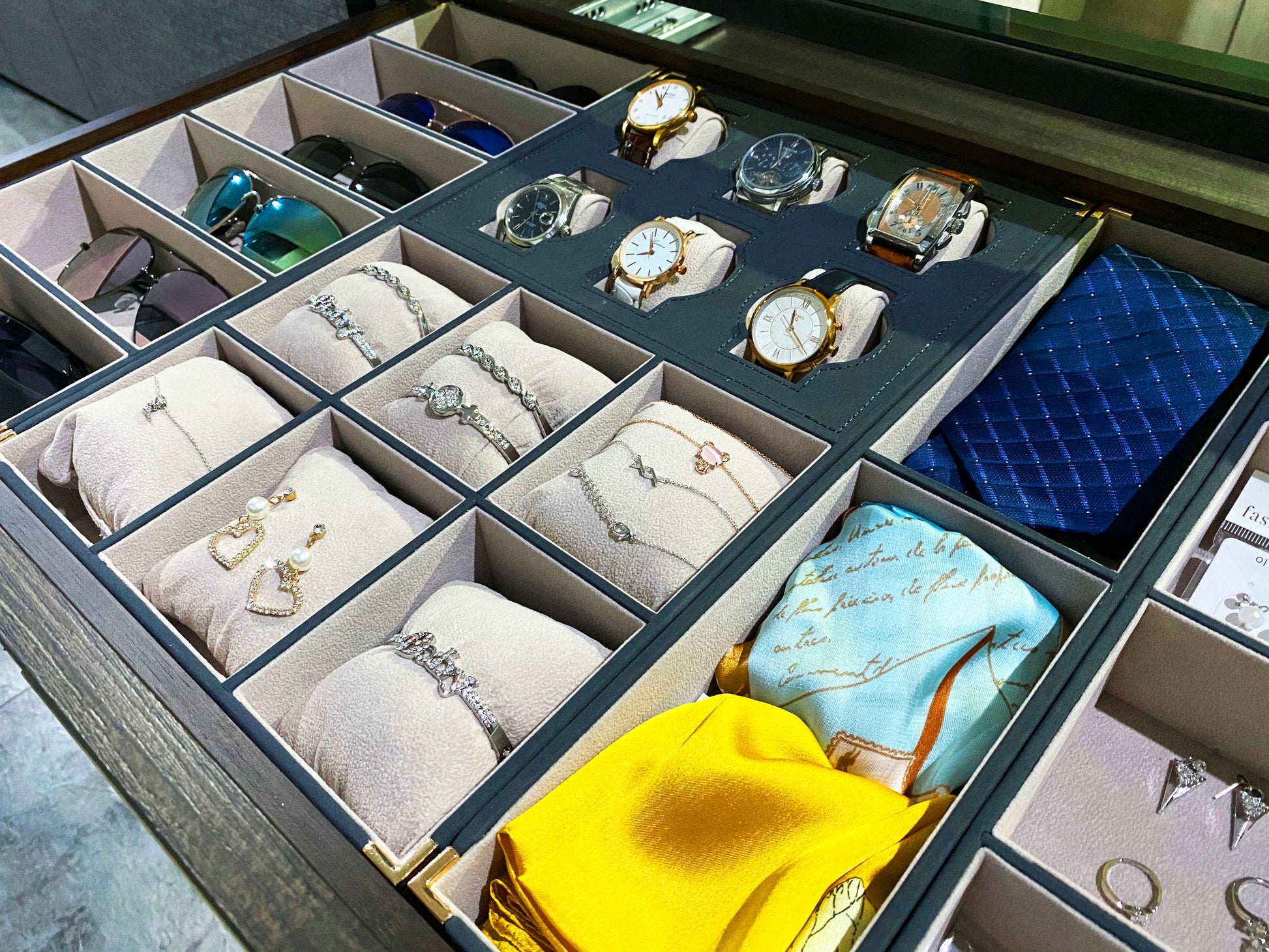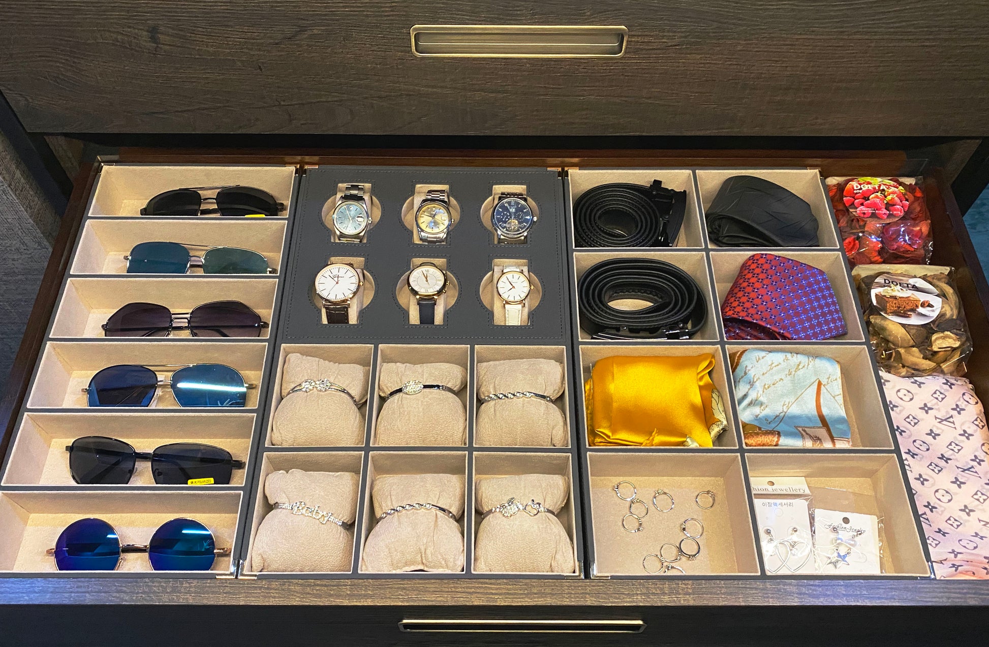 • Designated Compartments: The box includes designated compartments for glasses, watches, bracelets, necklaces, and various other jewelry accessories, ensuring each piece has its place.