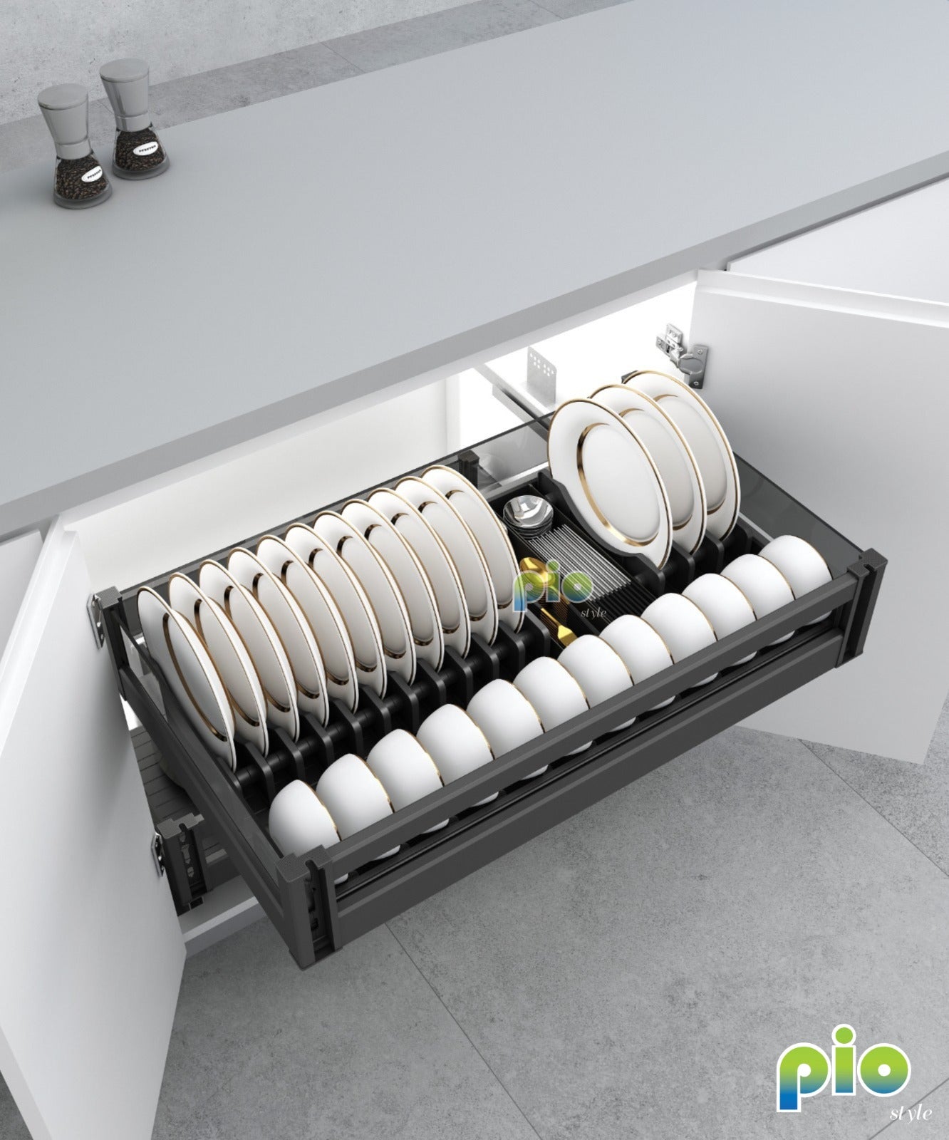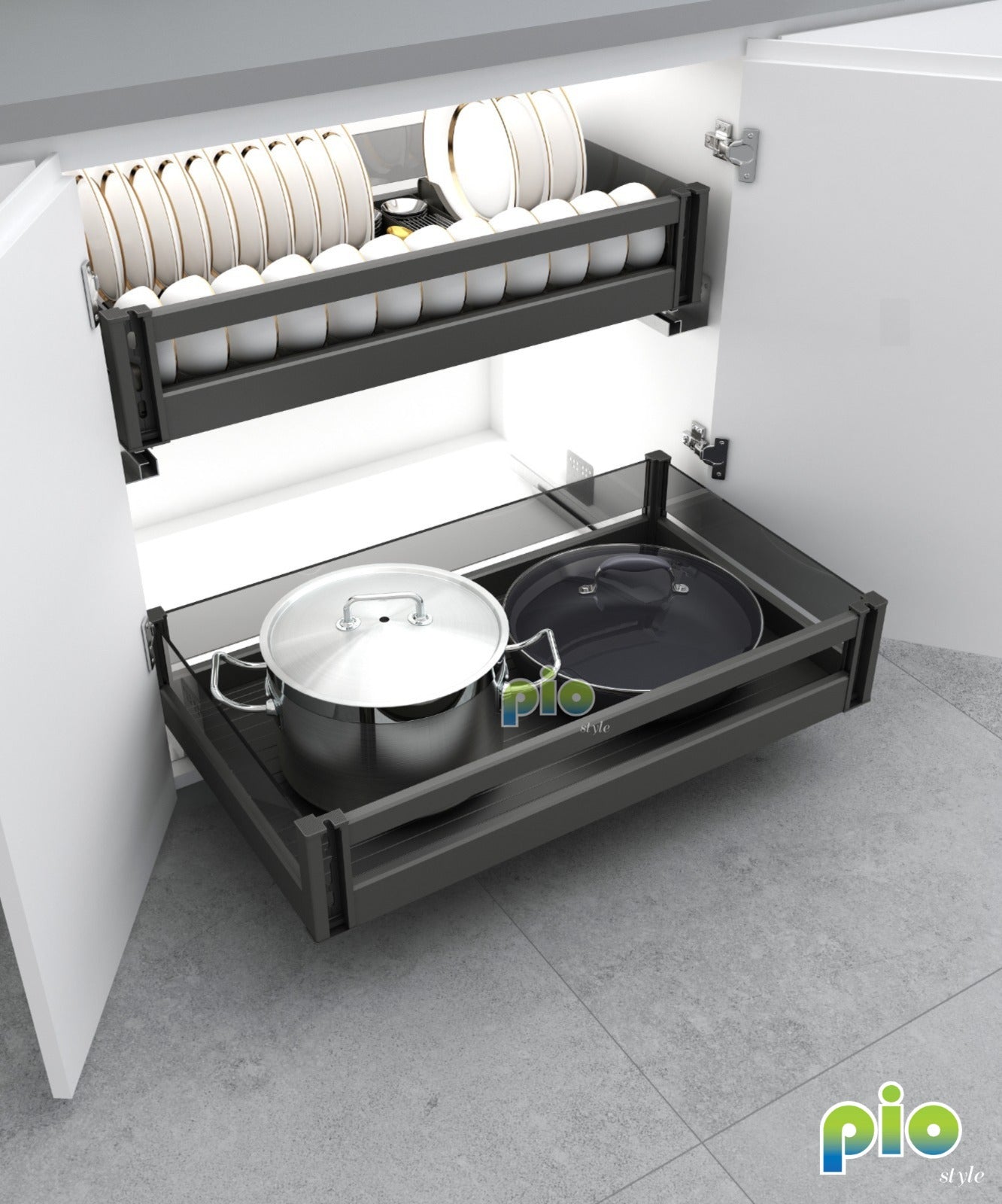 Enhance your kitchen's efficiency and elegance with our double-drawer system. The upper drawer features customizable compartments for plates, bowls, and utensils, while the lower drawer accommodates pots and larger items. It's aluminium based, this design offers a sleek, modern look.