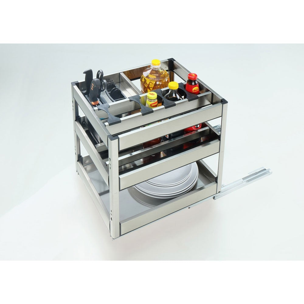 Enhance your kitchen's efficiency with our three-tier storage unit. The top layers feature dividers for organization, along with a dedicated cutlery box and knives holder. The bottom layer offers extra height for larger items. Streamline your kitchen setup effortlessly.