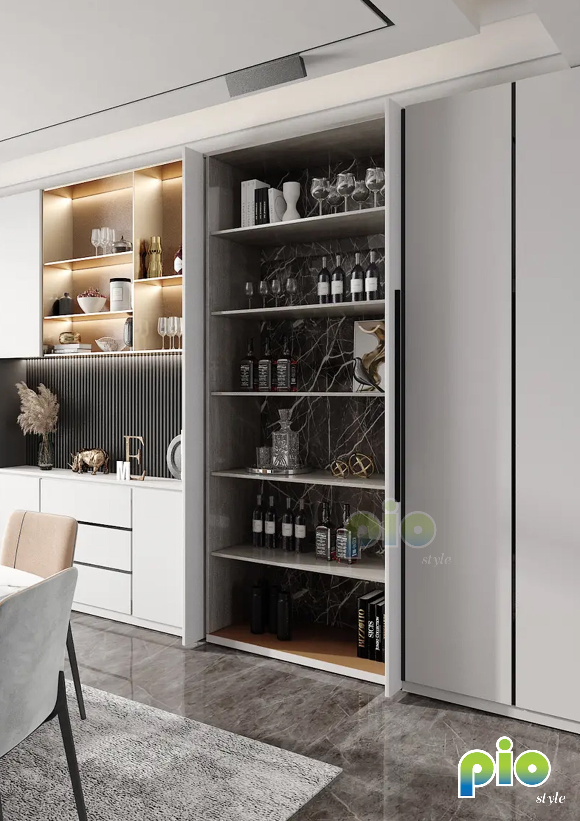 • Concealed Counter Design : Pivot (pocket) door design creates a hidden workspace or counter. Easily closed to keep coffee, wine, or appliances neatly concealed.