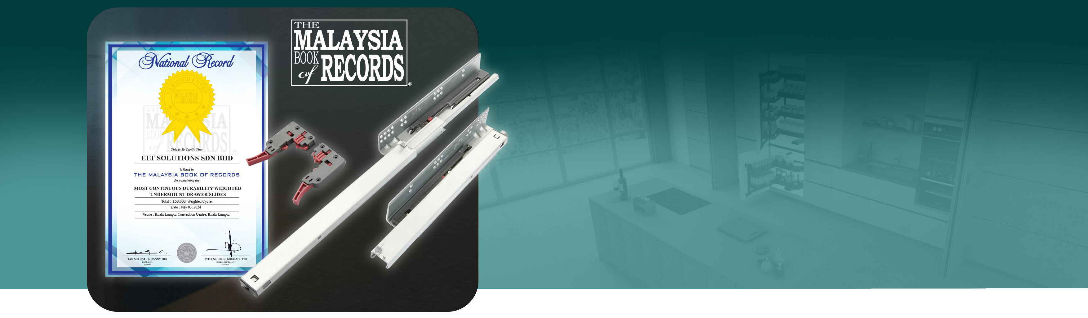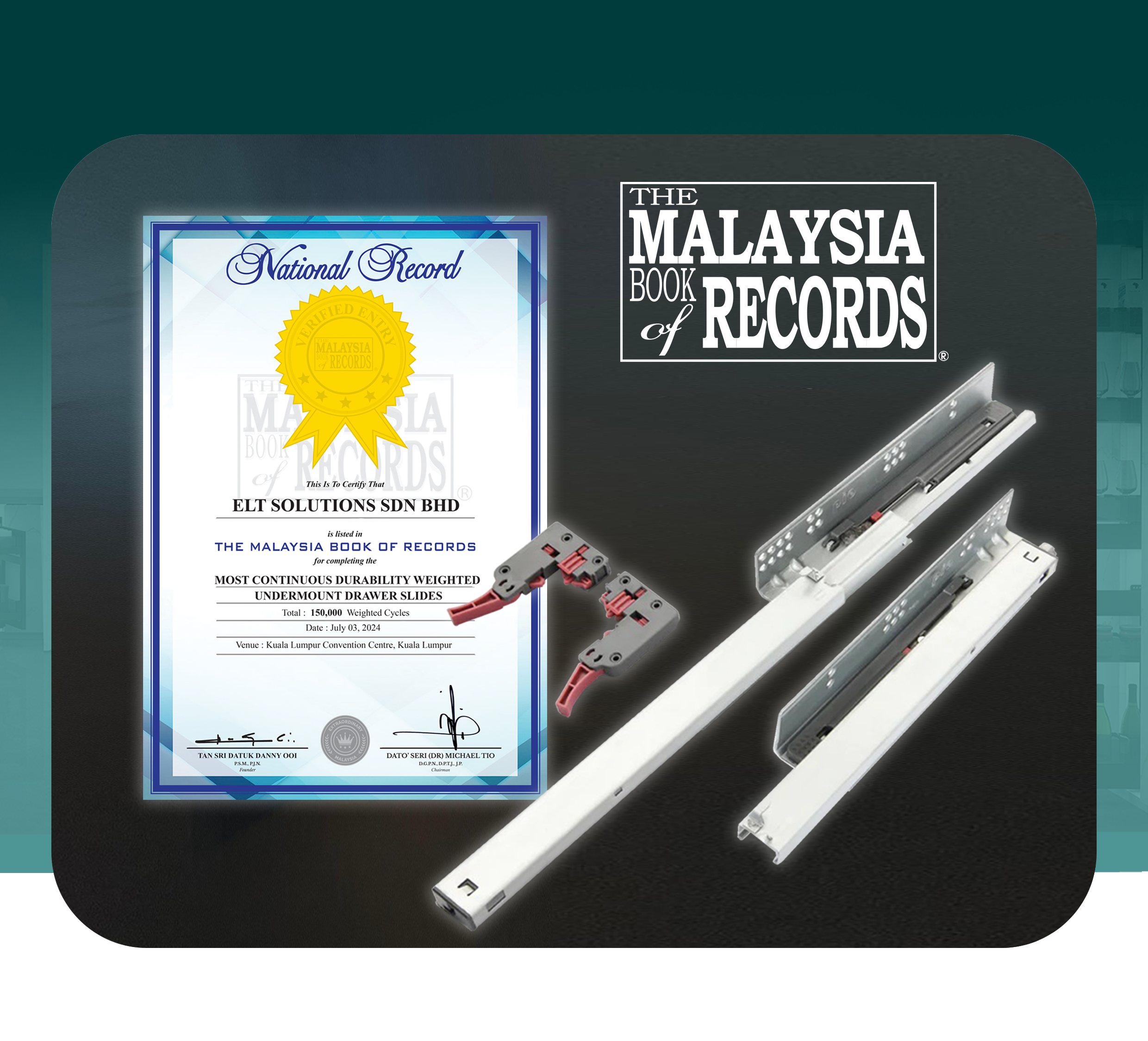 We've been verified by the Malaysia Book of Records for the most continuous durability testing of weighted undermount drawer slides: 150,000 cycles with 35kg!
